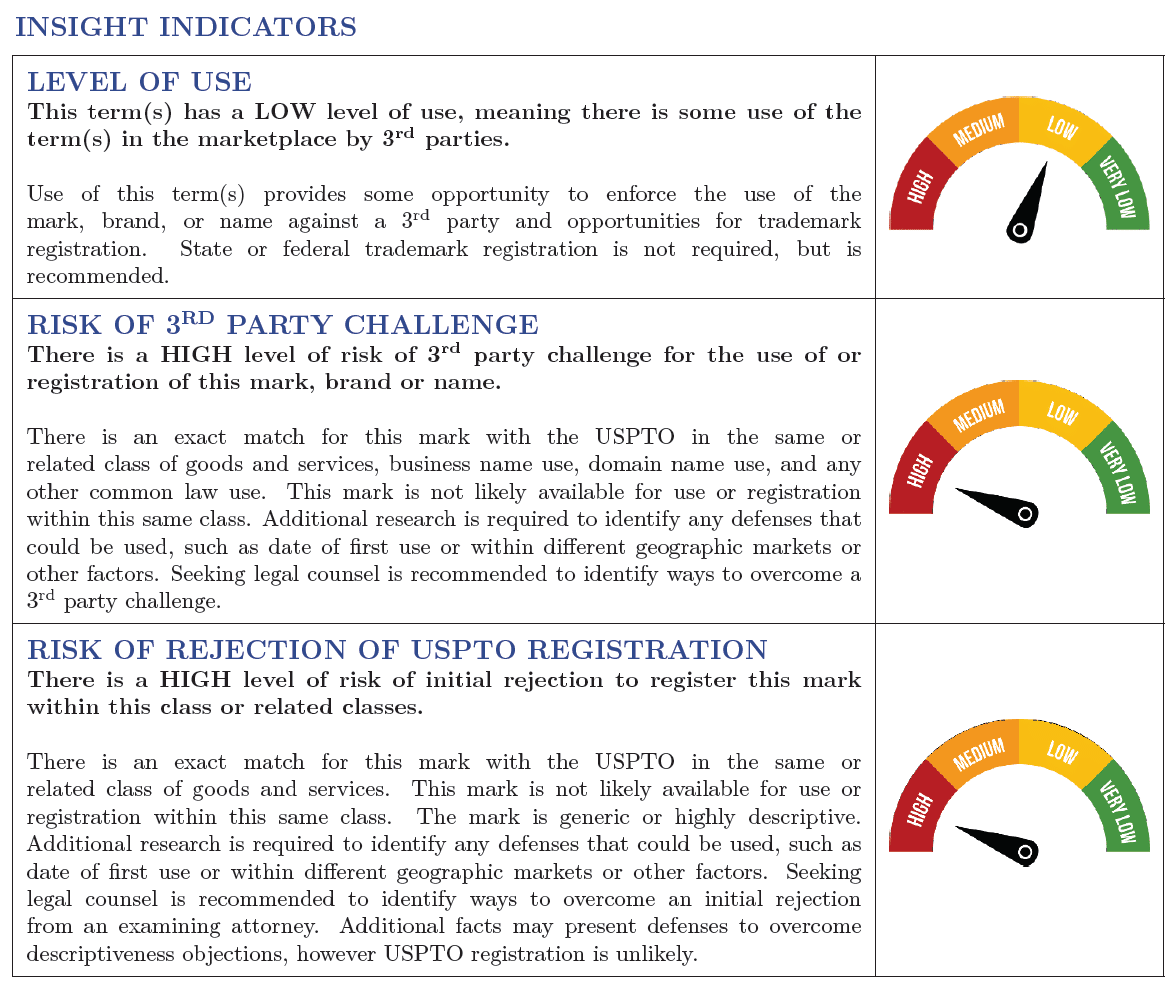 Insight Indicators by Iris Daly | Jul 5, 2017Three gauges of analysis, insight indicators for Level of Use, Risk of third-party challenge, and Risk of USPTO...